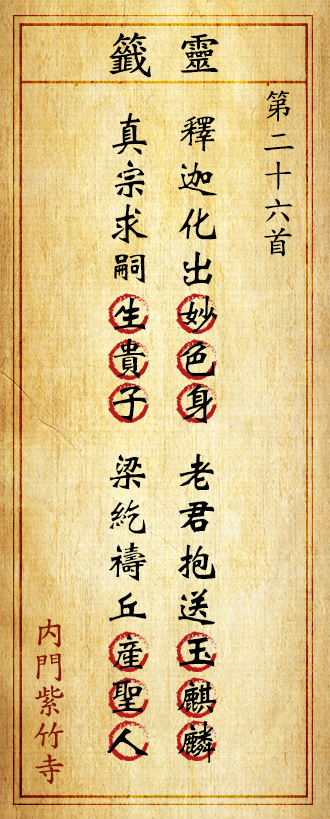 這首籤詩,四句皆有典故,很難解說明白,只好稍加註釋,讀者自可心領神會。按「色身」一詞,乃佛家語,自四大五塵等色,佛化而成之身,謂之「色身」。引伸為化出一個超脫凡塵的骨格。麒麟,傳說中的奇獸,似鹿,背毛五彩,不食生物。聖人出,王道行則見。小兒穎異者,亦以天上麒麟兒稱之。宋真宗之子仁宗,恭儉仁恕,慎刑愛民,為有宋第一仁主,在位四十一年。梁紇,孔子的父親,求子禱於尼丘,乃生下孔聖人。