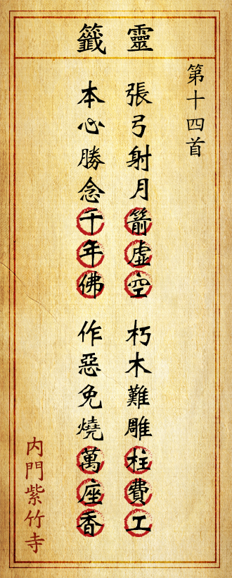 這首籤詩提示得籤的人,一切運氣的好壞,不是你所能強求的。如果你所求的,太過妄想,就如同向月射箭,定必箭箭落空。如果時機未到,就像朽木不可雕,你要勉強去雕刻它,也是枉費工夫罷了。