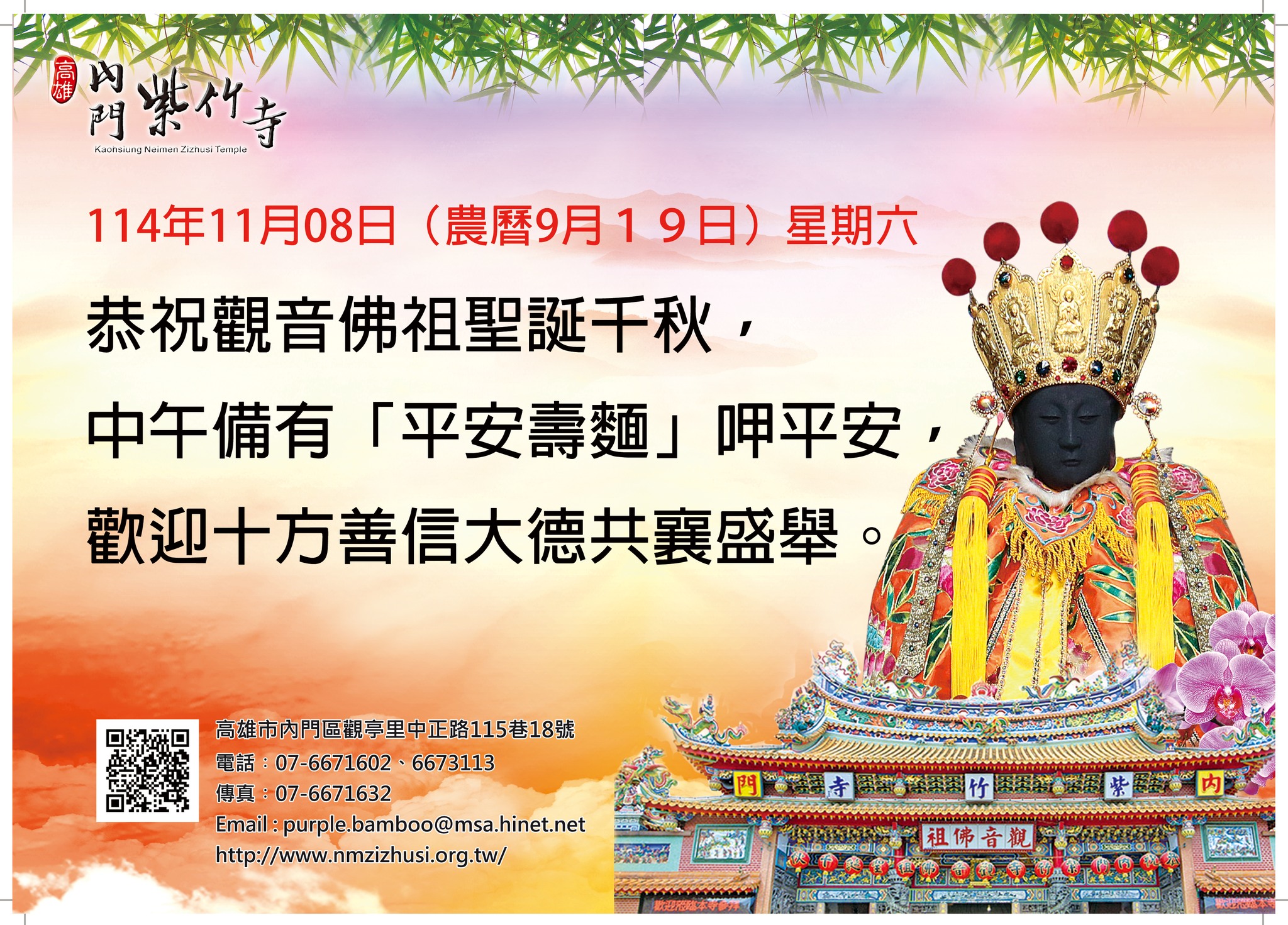 恭祝觀音佛祖聖誕千秋 114年11月08日(六 )上午11點起,提供平安壽麵呷平安,歡迎善信大德共襄盛舉