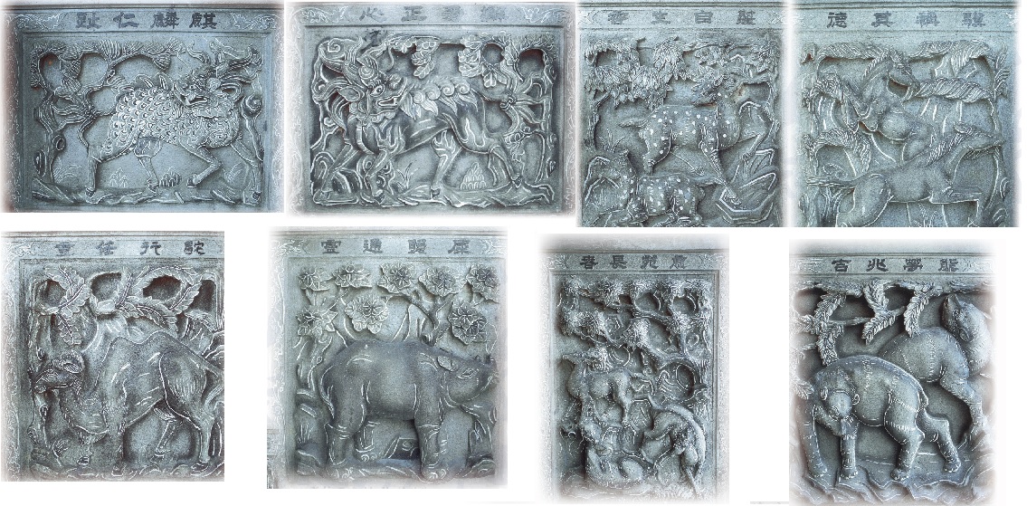 第五層脊肚下凹線:正中為麒麟及虎豹獅象四獸,寓意「祥瑞、馱負」 ,兩側並有花鳥用以調合。