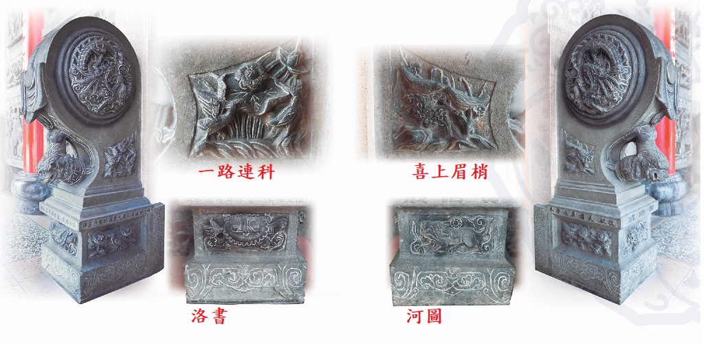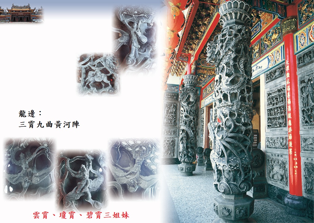 龍柱:寺廟的柱子有木、石等材料,裝飾以龍最為常見,而習稱為「龍柱」;有單龍、雙龍,再穿插《封神榜》或其他故事為主題的「人物帶騎」 ,另外再加水族、鯉躍龍門等紋樣。