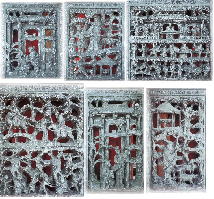 正立面:門與門之間的牆面稱為「壁堵」 ,早期大都下半部石堵,上面為木扇,後來漸漸發展成石堵,蓋因石堵越多表示這座廟越尊貴。石堵也跟木扇一樣,分成堵腳、裙堵、腰堵、身堵及頂堵,這是把廟「擬人化」 ,用意是讓它自己站起來。身堵位於人們視覺的水平線上,都把它透雕成窗子,花樣繁多,圖案擷取歷史人物,忠孝仁義廉節故事,早期教育設施不普遍,這些石雕故事對庶民具有人文化成的作用。
