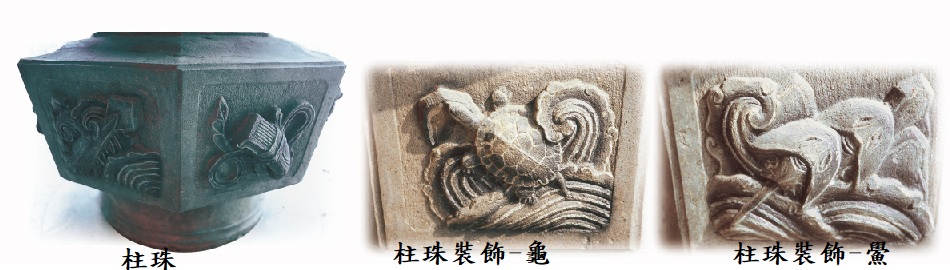 柱珠:三川殿的台基上柱子下襯有柱珠,這是一根柱的基礎,稱為「柱礎」或「石珠」 ,作用原在於防止木柱受潮,在裝飾上有各種花樣,如:琴棋書畫、四寶、八吉祥⋯⋯等。