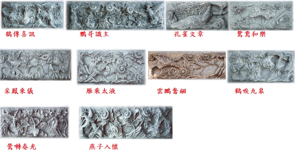 腰堵:一般寺廟石堵多以「博古架」裝飾,本寺分別以花鳥來裝飾,有「鵲傳喜訊」 、「鸚哥識主」 、「孔雀文章」 、「鴛鴦和樂」 、「采鳳來儀」 、「雲鵬奮翮」 、「鶴唳九皋」 、「雁乘太液」 、「燕子入懷」、「鶯囀春光」。
