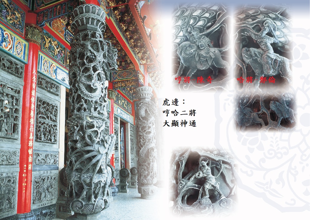 採「雙龍柱」 ,並襯以《封神榜》故事精彩片段,龍爿(左邊)以「三霄九曲黃河陣」 ,虎片(右邊)以「哼哈二將大顯神通」為主題的「人物帶騎」 ,外加水族、鯉躍龍門等紋樣。