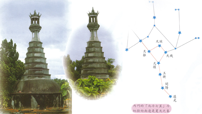「七星塔」位於觀亭里北部菜公坑溪右岸的平原,由於最早有七堆土墩呈「北斗七星」的形狀,散佈在平原上,台語平原之地形亦稱為「洋」所以舊地名稱為「七星洋」。地方耆宿相傳,說是在古早的一個夜晚,夜空中有七顆流星飛降在內門觀音亭聚落一帶,散落在方圓二、三平方公里的原野上,排列形狀宛如「北斗七星」的七個土墩,這神蹟地自古就稱為「七星墜地」。
