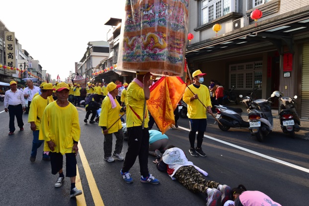 信眾大排長龍跪地「鑽轎腳」,以求平安好運。