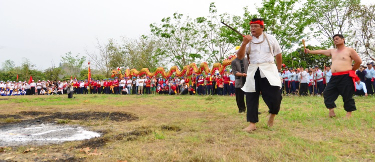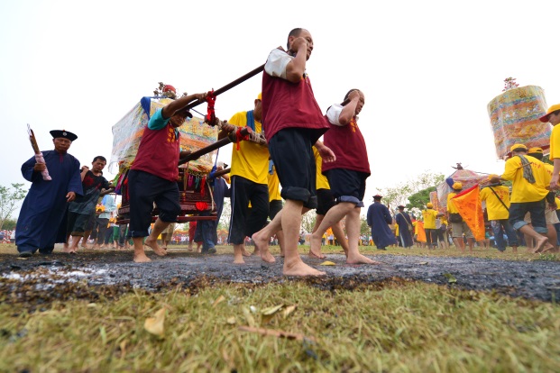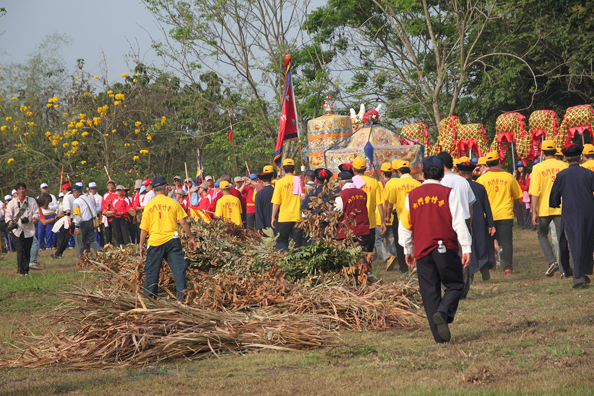 火堆先以龍眼樹柴堆造七處,燃燒後打平、撒鹽降溫。【圖片中為踩火堆】