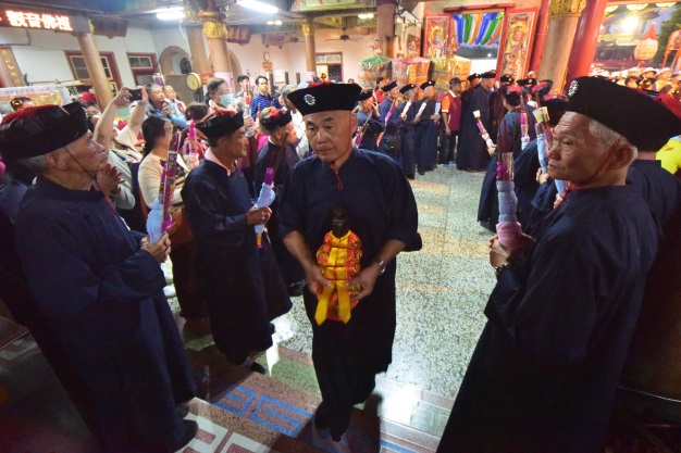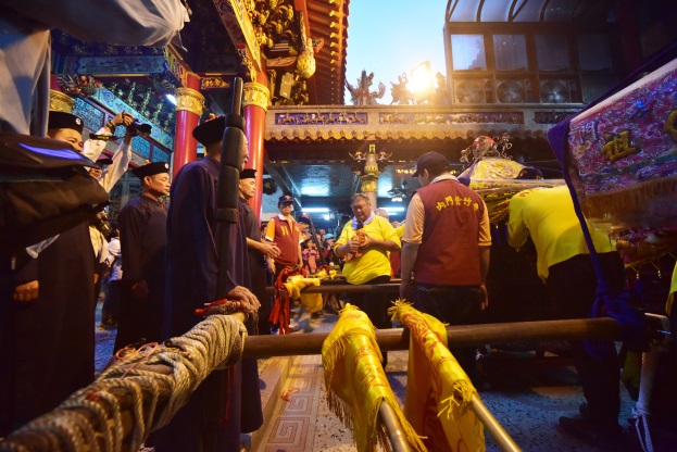 停轎後,所有神尊逐一被迎請出轎,眾丁頭則於正殿前排成兩列恭迎安座。