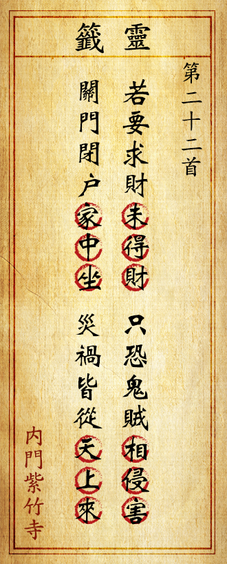 若要求財而得不到財,那恐怕是有五鬼小人侵害的關係。為人在世,富貴本乎前定,何須強求?只要照本份去做,行動循乎天理,天必佑之,否則,即使關門閉戶家中坐,災禍還是會從天上來。降福降禍,為人自召,此乃種瓜得瓜、種豆得豆之理。