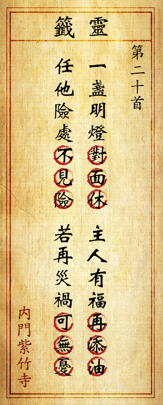 抽得此籤表示,你如果碰到親戚朋友,或是陌生人有困難時,你不可見死不救,應該伸出援手來幫助他或她解決困難。也許你平時已經做了不少善事,但是為善不怕多,希望你一本初衷,繼續行善,這樣一來,凡事必能順遂,臨險不險,逢凶化吉。