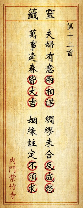 問婚姻:皆大歡喜,幸福美滿之良緣,婚談可以成功,佳期在春後。