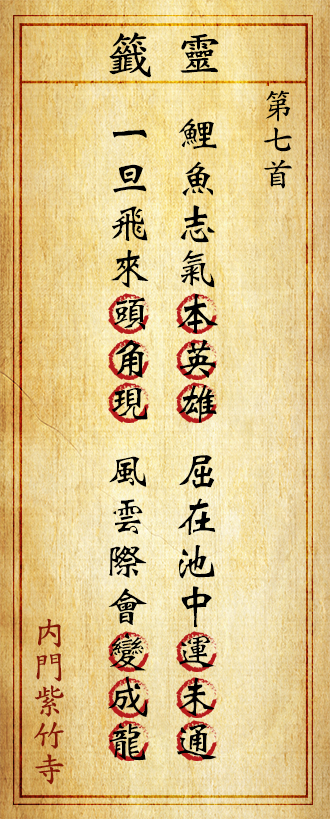 此籤乃告訴當事人不要為目前的遭遇嘆氣,只要你能夠立志做大事,總有一天,會有機會讓你表現的。目前時運未通,所以只好委屈一下,守住你的崗位,默默的工作,同時要多充實自己,這樣,有一天你的機會來了,就可以發揮你的才華,成為眾人矚目的英雄了。