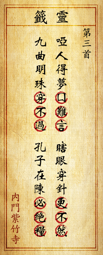 抽到此籤,表示一個人也有啞巴吃黃蓮,有苦說不出的時候。時運若不濟,再高的學問,再能幹的才華,也有碰到困境的時候。