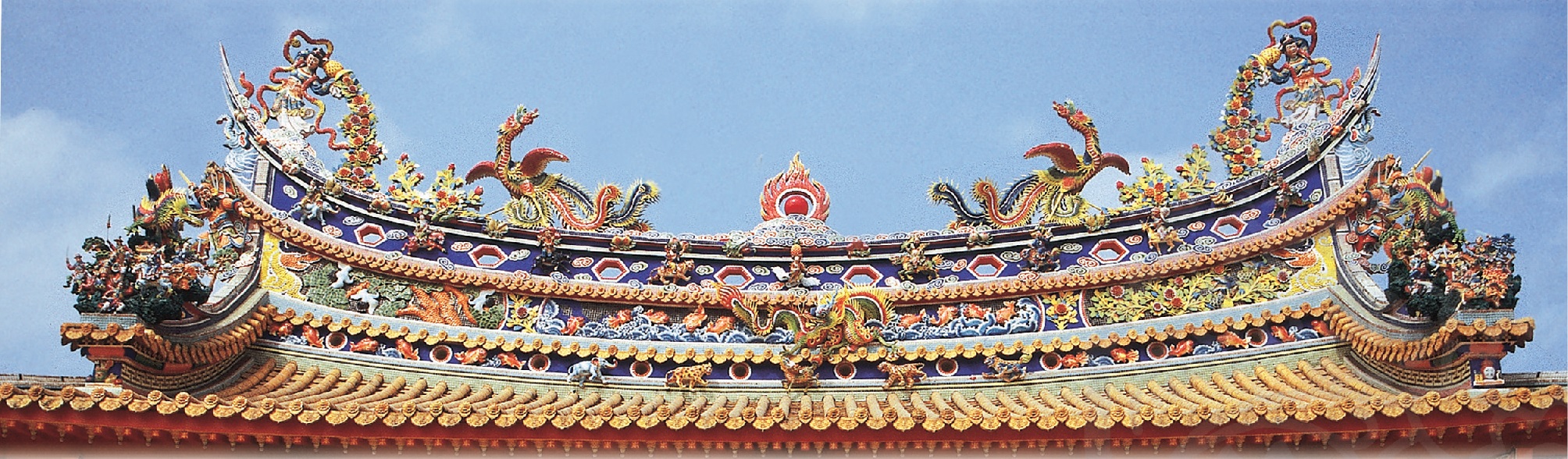 屋頂:廟宇以屋頂裝飾最為壯觀。主脊曲線流暢有一種展翼凌空的氣勢;主脊上下緣分稱為「上、下馬線」 ,兩線的中間地帶稱為「脊肚」;由主脊向前後方向下垂的垂脊叫「規帶」 ,其下方做成收頭裝飾以剪粘泥塑造形;側面叫「山牆」 ,山牆頭頂部叫「鵝頭」 ,因形似馬鞍又稱為「馬背」。