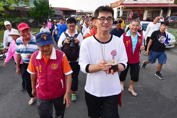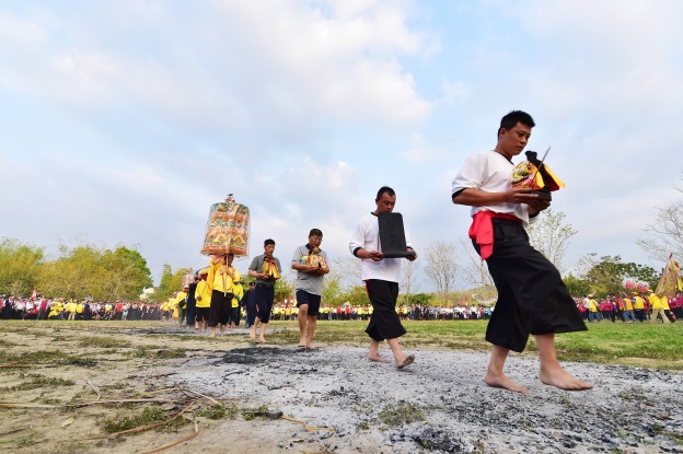 火堆先以龍眼樹柴堆造七處,燃燒後打平、撒鹽降溫。【圖片中為踩火堆】