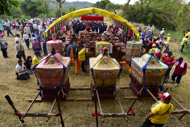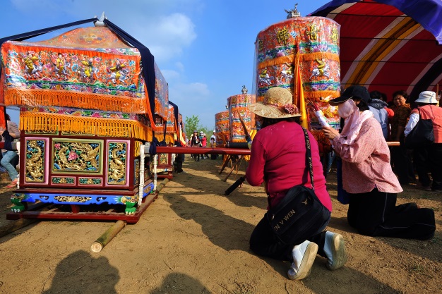 信眾大排長龍跪地「鑽轎腳」,以求平安好運。