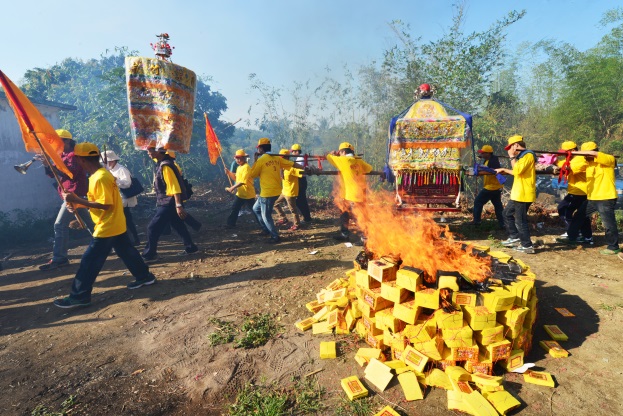 「主神三轎」遶行燃燒中的金紙堆而過。