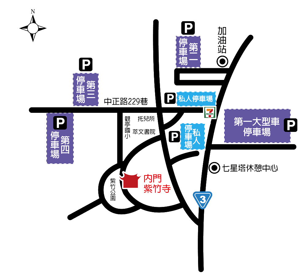 ★國道三號 → 官田系統交流道 → 北門玉井東西向快速道路(台84省道)→ 玉井區 → 台三線 → 南化區 → 內門區 → 內門紫竹寺